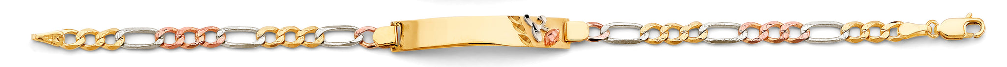 14K Tri Color Gold Figaro Flower ID Bracelet