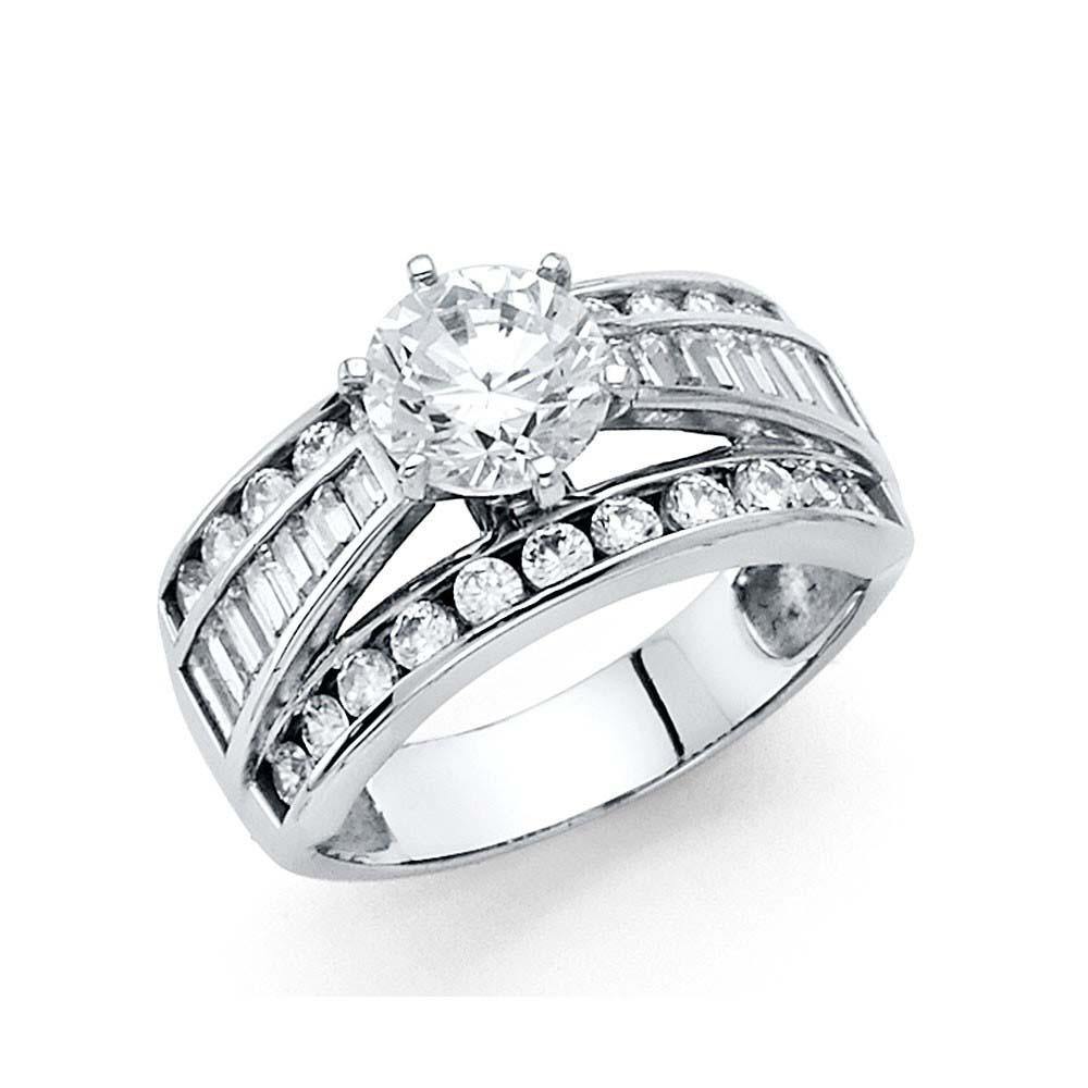 Wholesale 14K White Gold 1.25=CT 6-Prong Round Cut And 3-Row Side CZ Engagement Ring Weight-5.3grams, Width-8mm