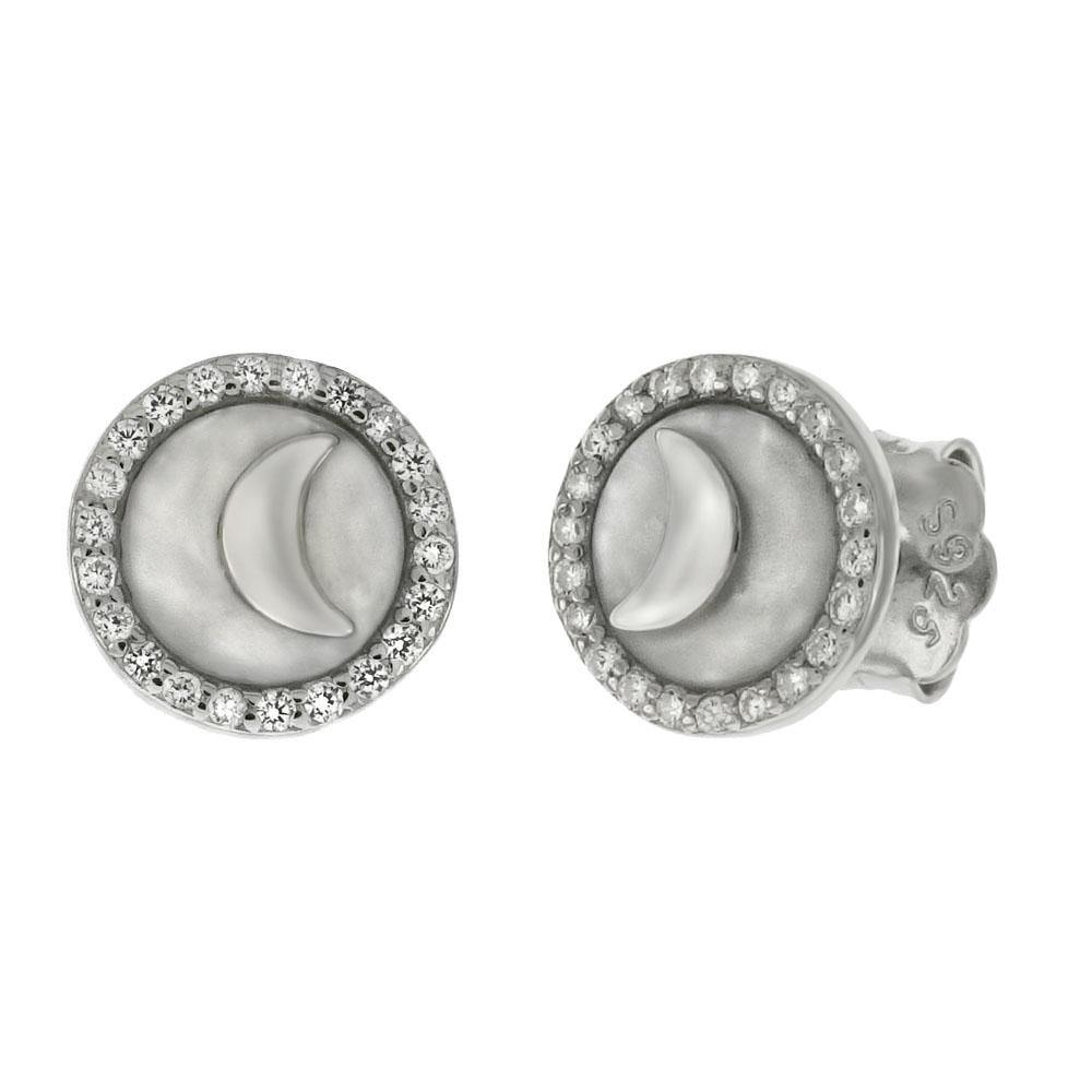 Sterling Silver Crescent Moon On Pearl Shell With CZ Stud Earrings
