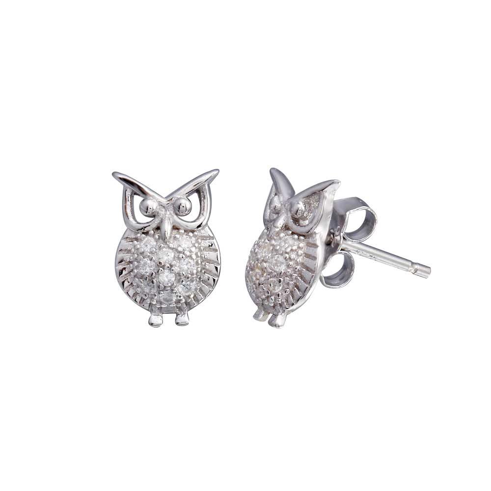 Sterling Silver Rhodium Plated Owl CZ Stud Earrings