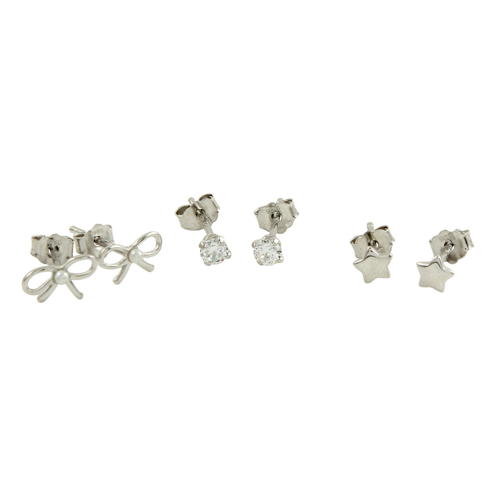 Sterling Silver Rhodium Plated Ribbon,Star And CZ Stud Earring Set