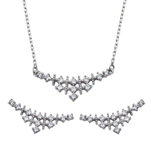 Sterling Silver Rhodium Plated Curved Triangle Clear CZ Earring And Necklace Set