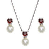 Sterling Silver Rhodium Plated Red CZ Heart Dangling Pearl Earring And Necklace Set