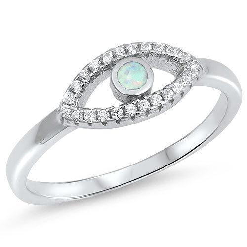 Sterling Silver Evil Eye Shape White Lab Opal Rings With CZ StonesAnd Face Height 6mm
