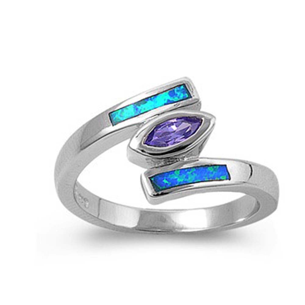 Sterling Silver Fancy Sideway Amethyst CZ Maquise Cut with Blue Lab Opal Inlay Bypass Band RingAnd Face Height of 13MM