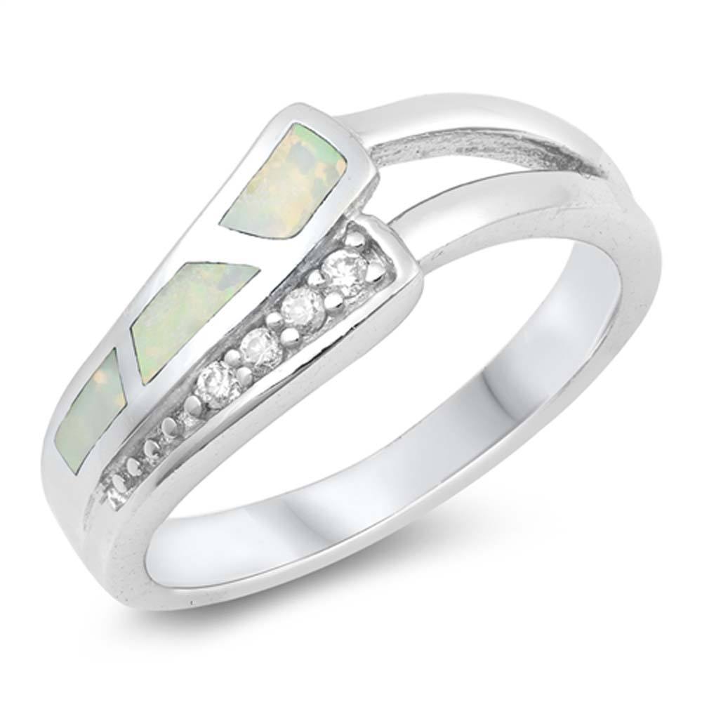 Sterling Silver Modern Stylish Curved Band with Clear CZ and White Lab Opal Inlay RingAnd Face Height of 7MM