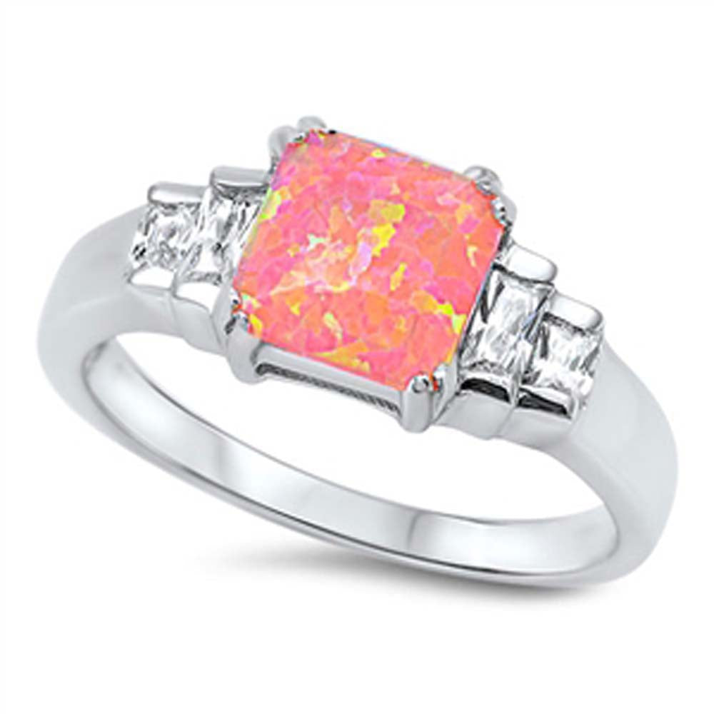 Sterling Silver Square Shape Pink Lab Opal Rings With CZ StonesAnd Face Height 7mm