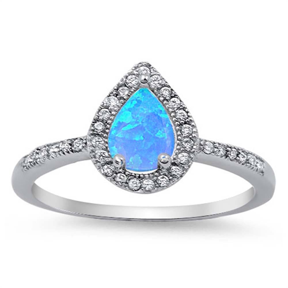 Sterling Silver Stylish Blue Lab Opal Pear Shape with Halo and Inlay Clear CZ Design RingAnd Face Height of 10MM
