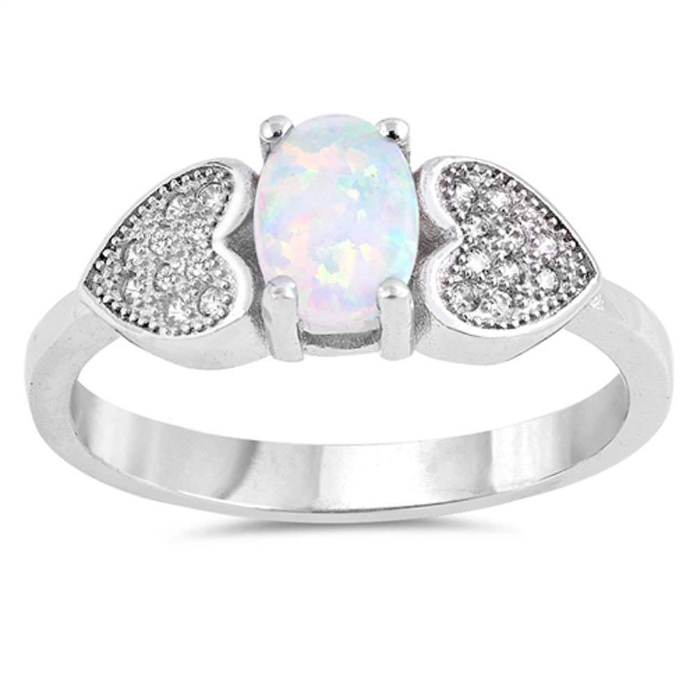 Sterling Silver White Lab Opal Stone with Clear CZ Side HeartsAnd Face Height of 7 mm