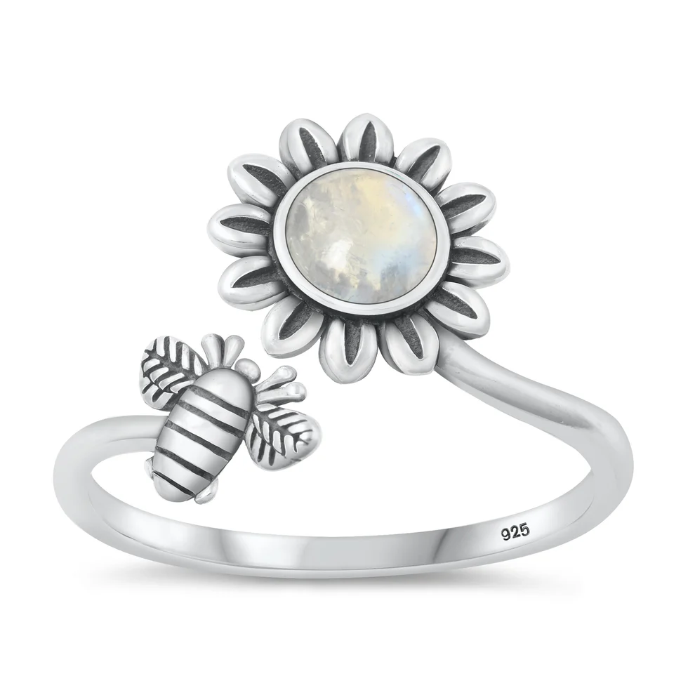 Sterling Silver Oxidized Flower And Bee Moonstone Stone Ring