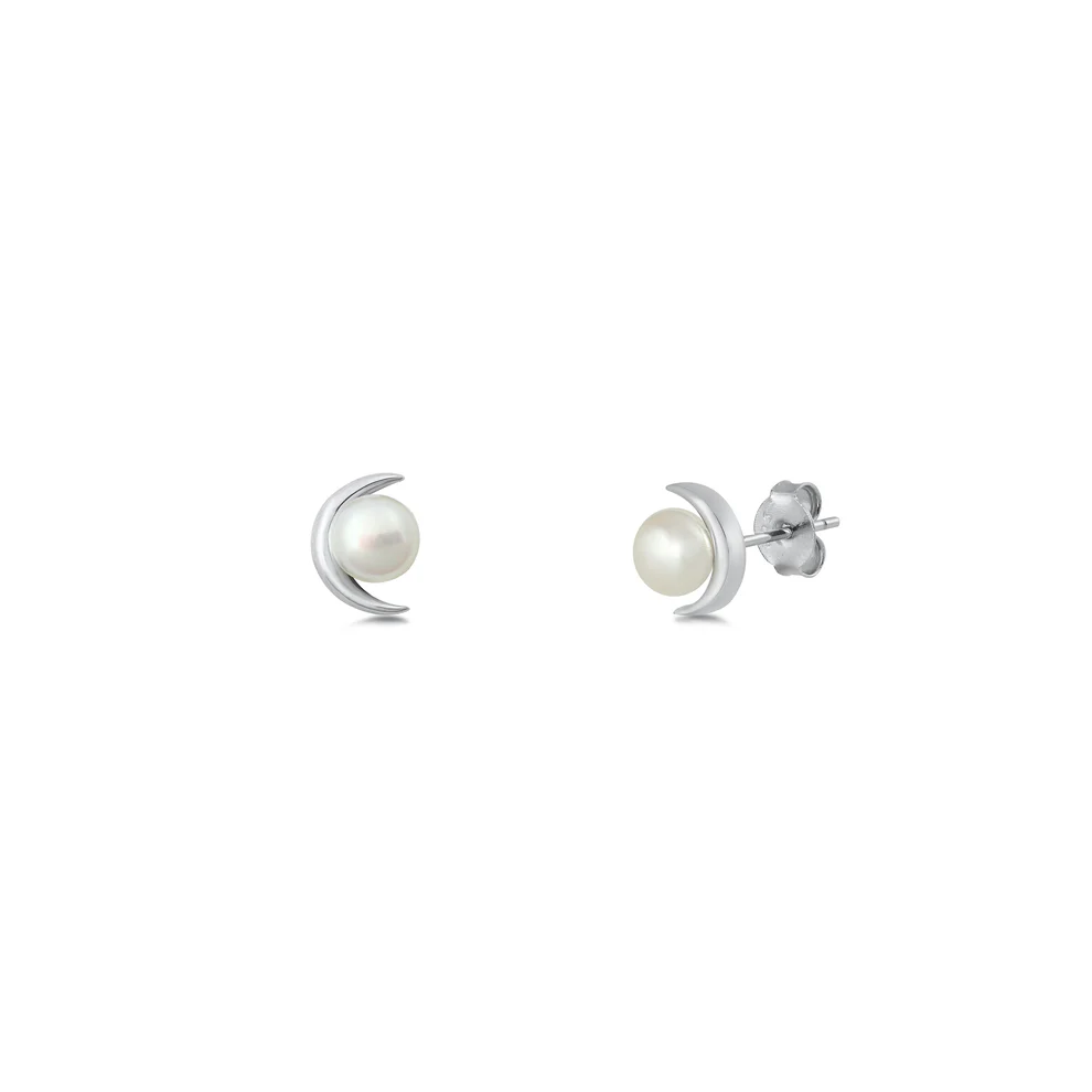Sterling Silver Moon And Pearl Stud Earrings