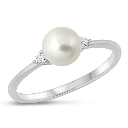 Sterling Silver Rhodium Plated Pearl And Clear CZ Ring