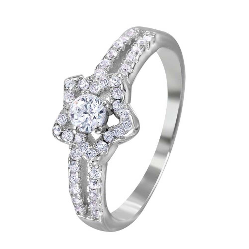 Sterling Silver Rhodium Plated Split Shank Open Star CZ Encrusted Ring