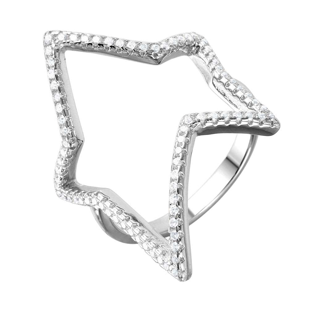 Sterling Silver Rhodium Plated Wide Open Star Shaped Ring With CZ Stones