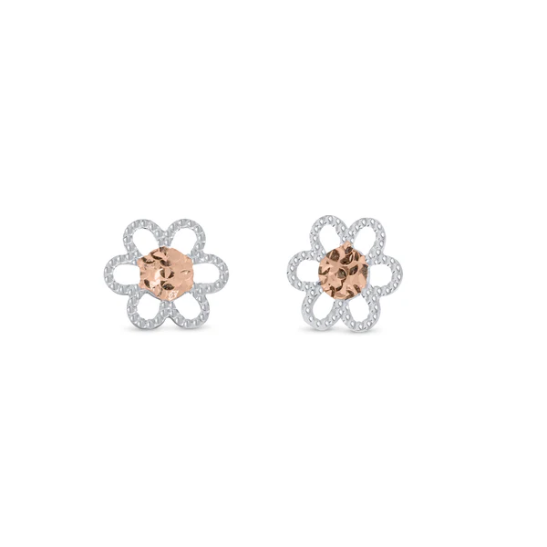 14K White And Rose Gold Beaded And Diamond Cut Flower Screw Back Earrings