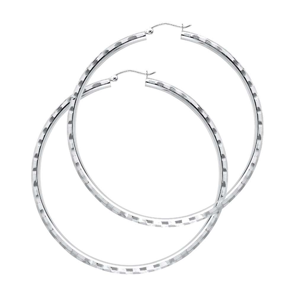 Wholesale 14K White Gold 3mm Large Polished Fancy Diamond-Cut Hinge-Notch Post And Latch Backing Hoop Earrings