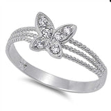 Sterling Silver Fancy Butterfly with Clear Czs Inlaid Open Cut Twisted Wire Band Ring with Face Height of 8MM