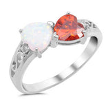 Sterling Silver Fancy White Lab Opal Heart and Garnet CZ Heart Ring with Swirl Designs and Clear CZAnd Ring Face Height of 8MM