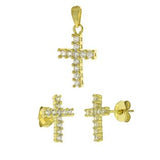 Wholesale Sterling Silver Gold Plated Cross Cubic Zirconia Earrings And Pendant Set Pendant Length-1inch, Pendant Width-11mm, Earring Width-1/2inch, Earring Width-8.5mm